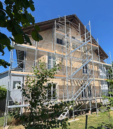 Zuverlässige Gerüstlösungen für Fassadensanierung, Anstrich, Dämmung und Außenwartung – sicherer Zugang in jeder Höhe.